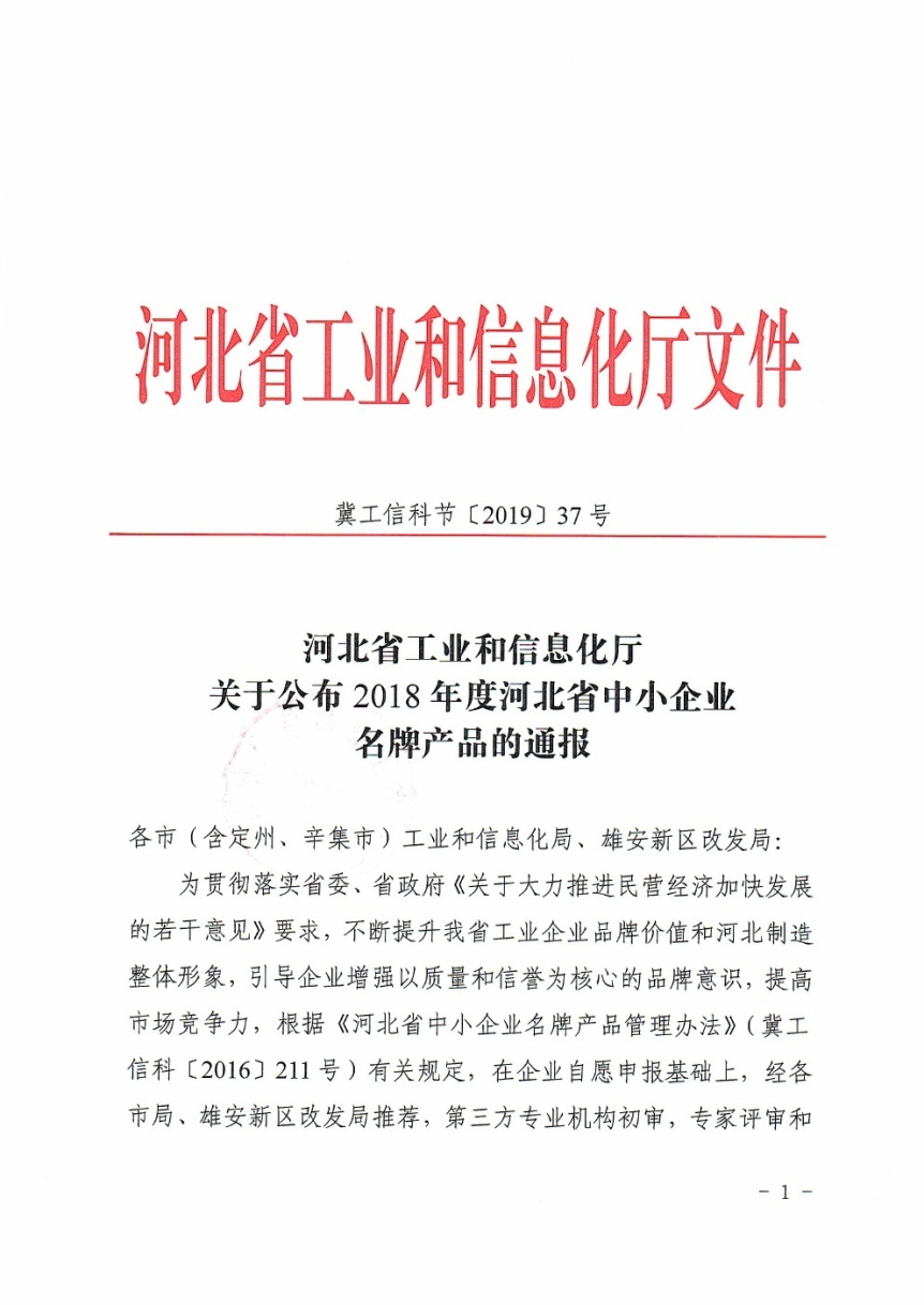 我公司获评河北省中小企业名牌产品