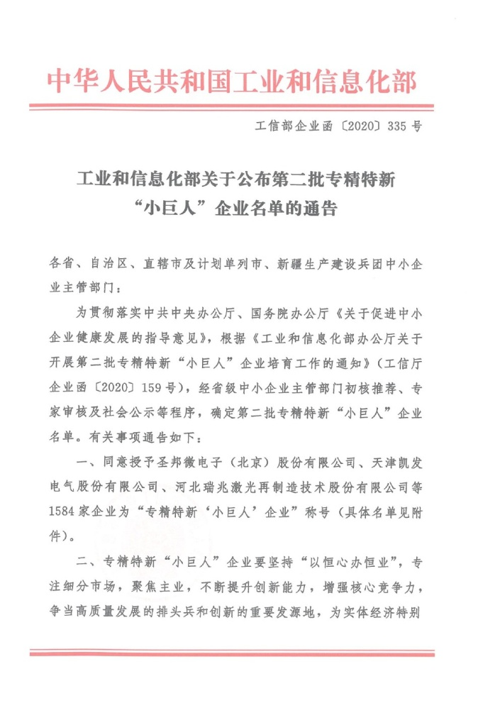 2020年12月11日,我公司被国家工业和信息化部认定为第二批专精特新“小巨人”企业。